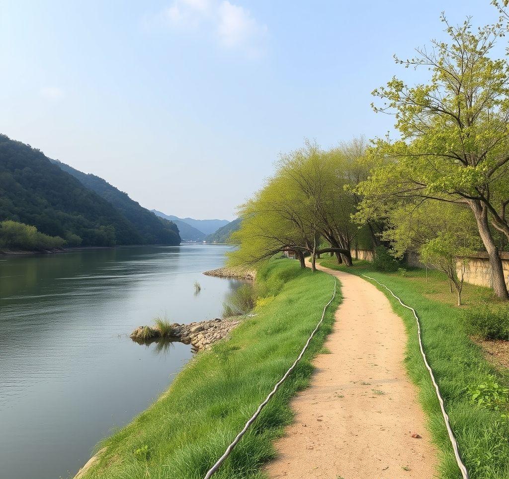 북한강변을 따라 조성된 남이섬의 평화로운 산책로